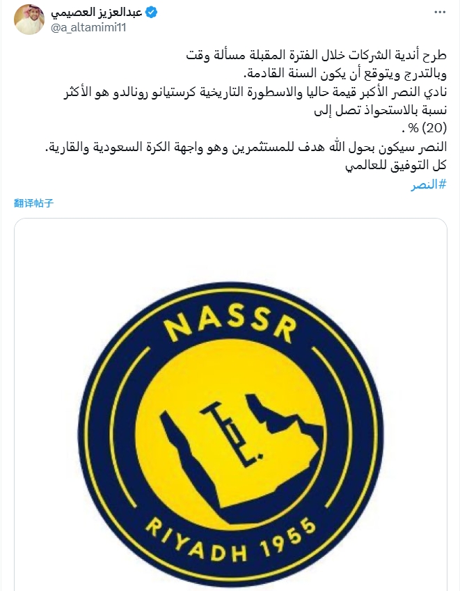 8月1日,沙特记者报道称,C罗现在拥有利雅得胜利20%的股份。